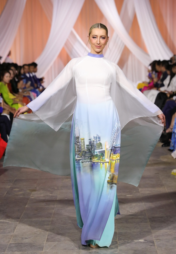 His team spent months meticulously painting and dyeing to perfect the 60 unique designs. Each ao dai in the collection is treated as a one-of-a-kind piece of art, vividly brought to life with sharp, realistic detailing by Trung Dinh's masterful use of colors and textures.