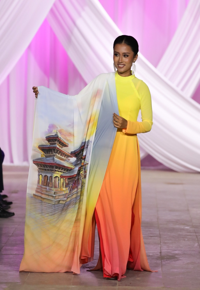 For Vietnam, Trung Dinh chose to depict the Trang An Scenic Landscape Complex in Ninh Binh Province, the home province of the representative of Vietnam at Miss Cosmo 2024, Bui Xuan Hanh. The pageant activities also took place in this iconic setting, enriching the cultural exchange.