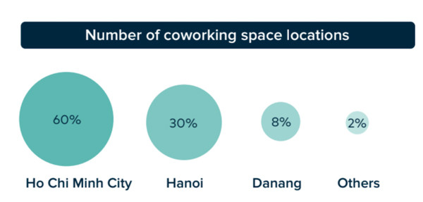 Most coworking spaces and serviced offices in Vietnam are located in metropolitan areas such as Hanoi with 64 locations, Danang with 18 and Ho Chi Minh City 97 locations.