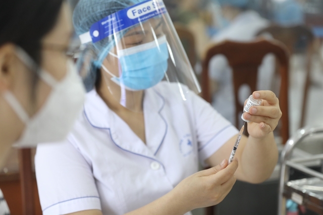 A medical worker prepares a COVID-19 vaccine shot for a resident in Thanh Xuan District, Hanoi.