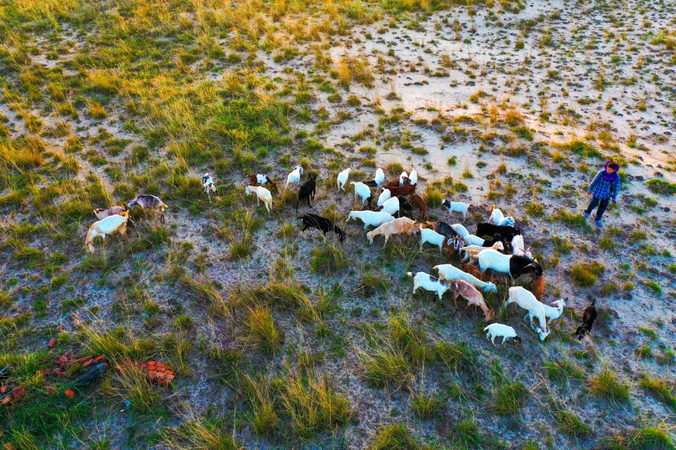 This captivating scene unfolds as the lawns on abandoned lands transition from yellow to fiery red, resembling the blazing embers of a wild grassland fire. Adding to the picturesque setting are herds of goats leisurely grazing and roaming across the untouched grasslands.