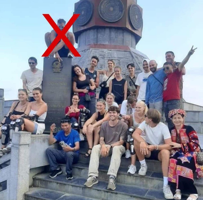 The photo which featured a group of tourists posing beside the Lung Cu Flag Tower and one of them sitting on an engraved marker was criticised by some people on social media.