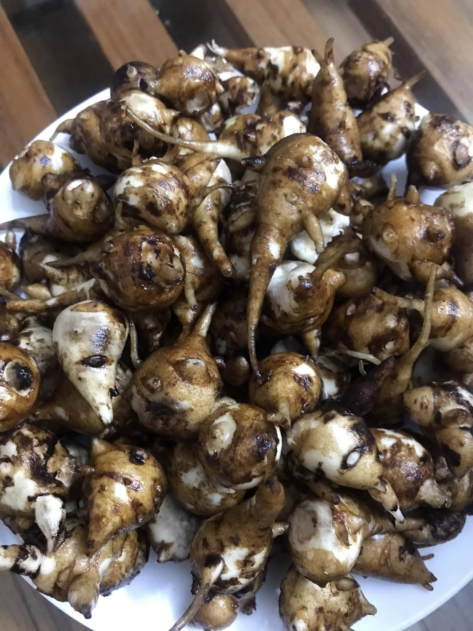 The au tau roots are peeled, soaked overnight in rice water, and thoroughly cleaned.