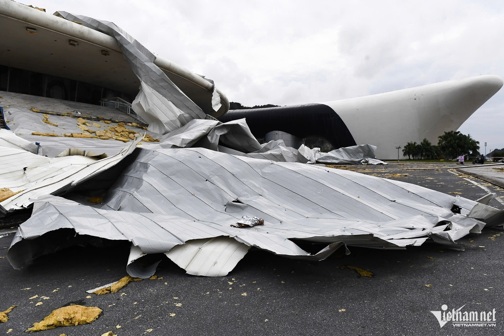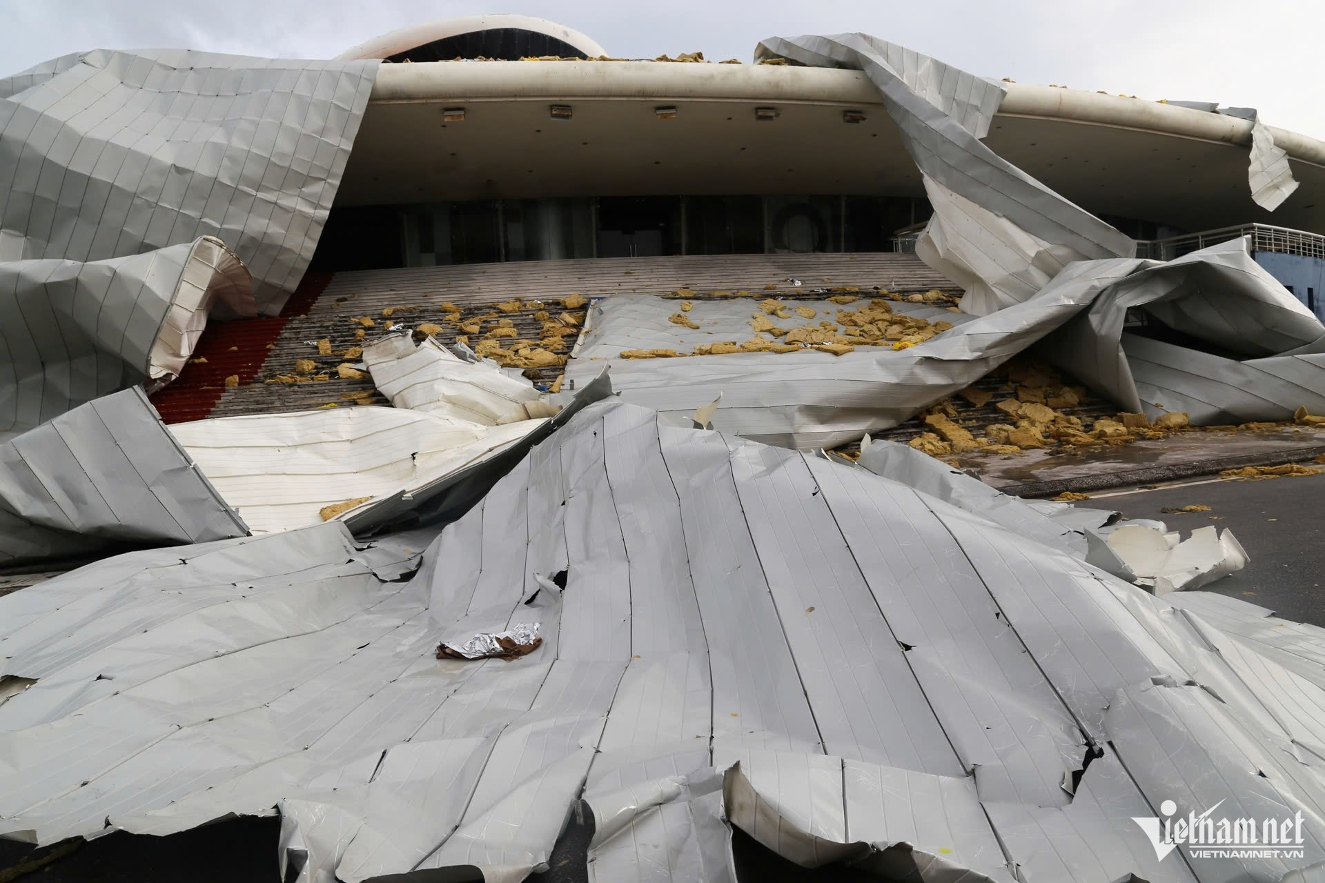 The center, with an investment of 1,000 billion VND, saw its roof severely affected as Typhoon Yagi struck on the afternoon of September 7. Strong gusts stripped large sections of the white corrugated metal roof, tearing it apart and scattering debris across the 30/10 Square and surrounding roads.
