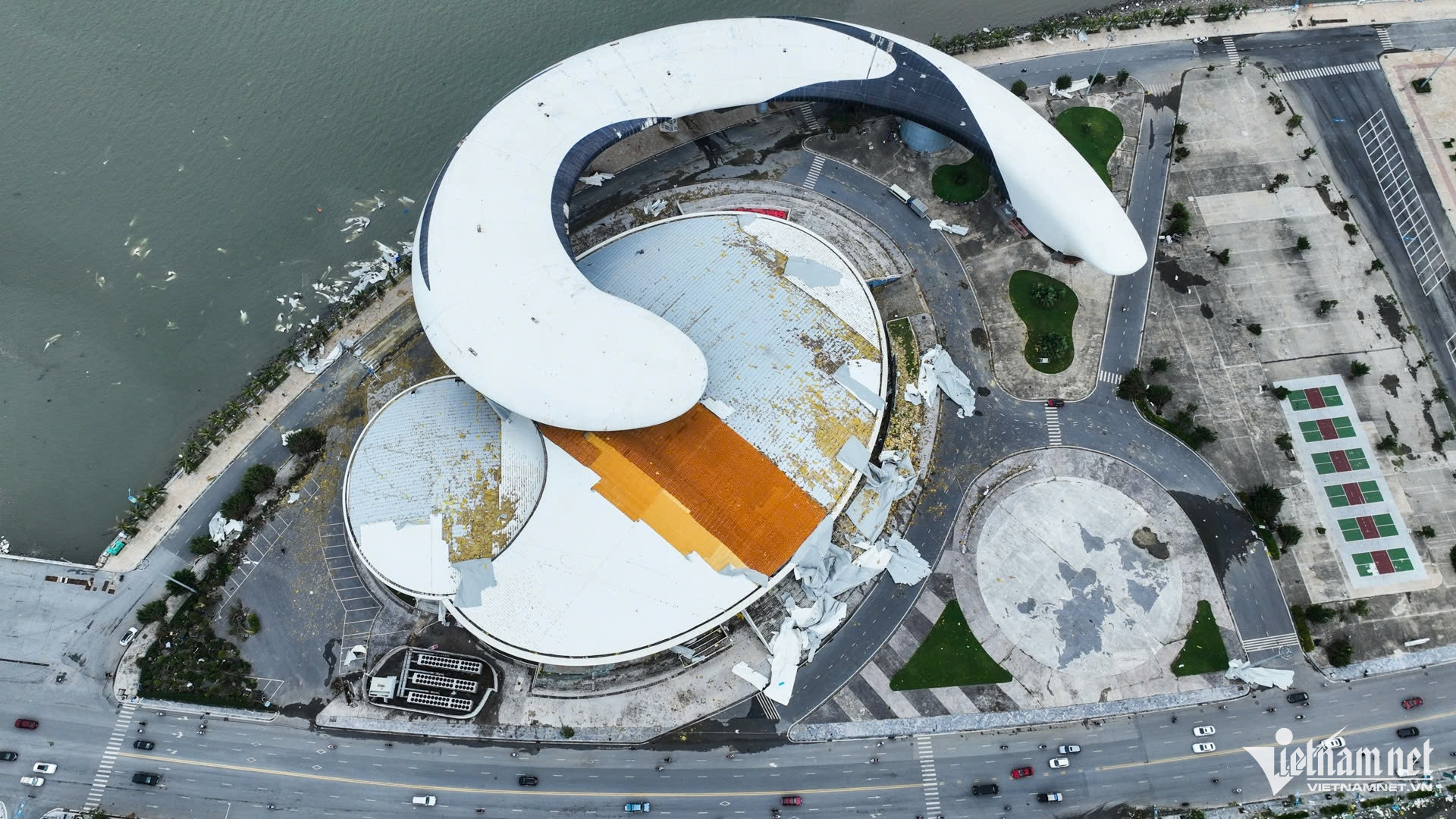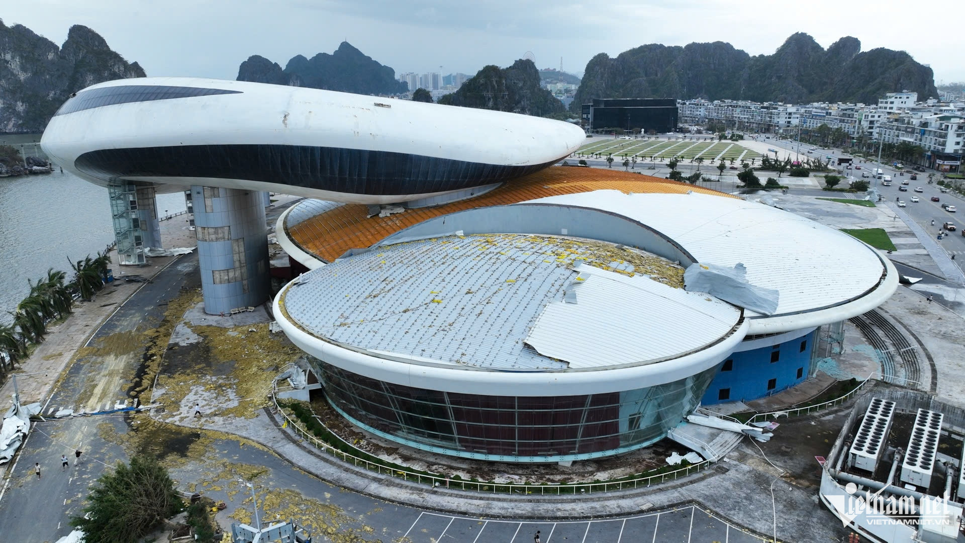 Located near the coast, the Quang Ninh Provincial Planning, Fair, and Exhibition Center, commonly known as the "Dolphin Palace" due to its dolphin-like shape when viewed from above, was heavily damaged.