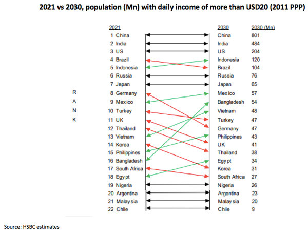 HSBC expected the expansion of the middle and upper-middle class would serve as the driving force for the development of consumer markets.