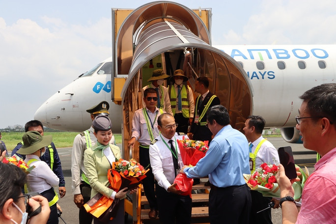 Vice chairman of Ca Mau Provincial People's Committee Lam Van Bi presents flower to the flight crew at the airport