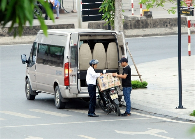 | A rogue vehicle parks illegally to unload a package and deliver it to a motorbiker. — VNA/VNS Photo An Văn Đăng |