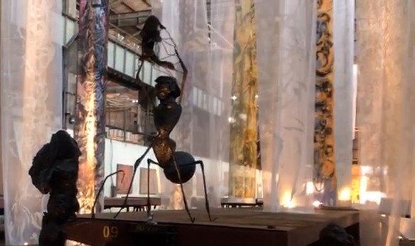 Standing prominently amidst the vast expanse of the ancient factory space are colossal, rugged sculptures of ants intricately crafted from iron and other materials, leaving a powerful impression on viewers.