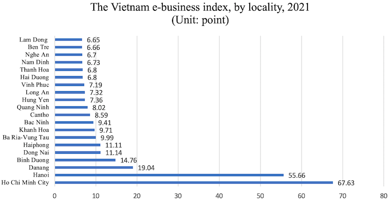 The Vietnam E-business Index (EBI) in 2021 was based on three key criteria: human resources and infrastructure in information technology, e-commerce transactions between enterprises and consumers, and among businesses.