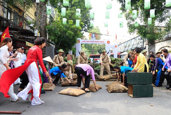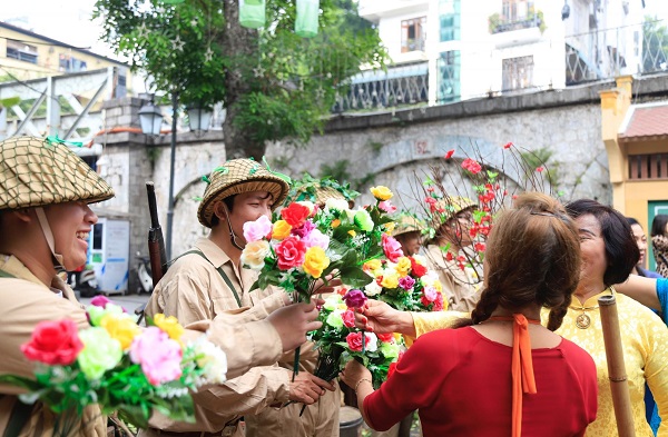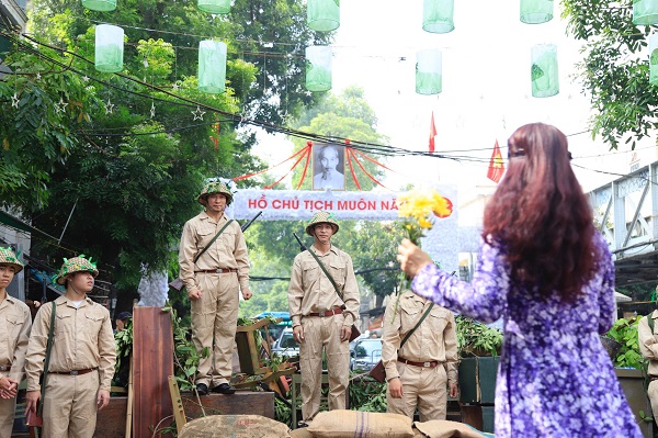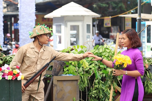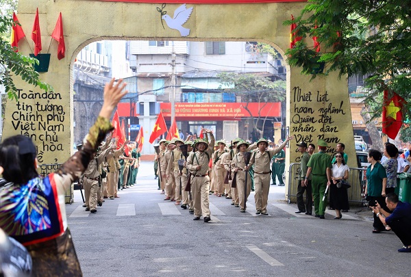 The reenactment of the triumphal march of the liberating army in Hanoi with citizens waving flags and flowers to welcome soldiers back from battlefield cheered up the Phung Hung mural street.