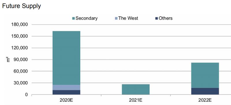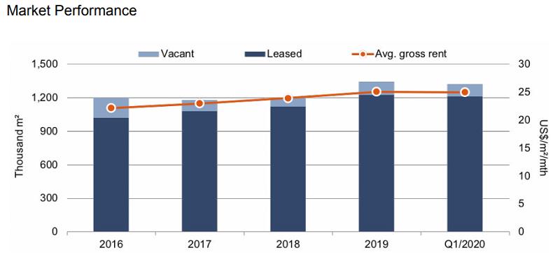 Q1/2020 take-up fell by 15,600 sq.m, the lowest in the past six quarters, mainly due to the closures of two Grade A projects. Highest take-ups were Grade B and the West; however, 2020 take-up will slow.