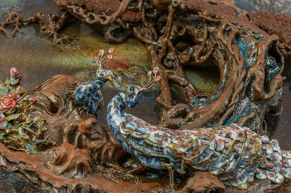 Meanwhile, the “Phu Quy Man Duong” ceramic plate weighs 400 kilograms and has a diameter of 1.37 meters, embossed and carved with a cedar tree and a pair of peacocks, along with such feng shui elements as a mountain and the sun to convey the meaning of eternal wealth, nobility, longevity, and happiness. The plate took about a year and a half to make, and established the record for “the Largest Carved Ceramic Plate”.