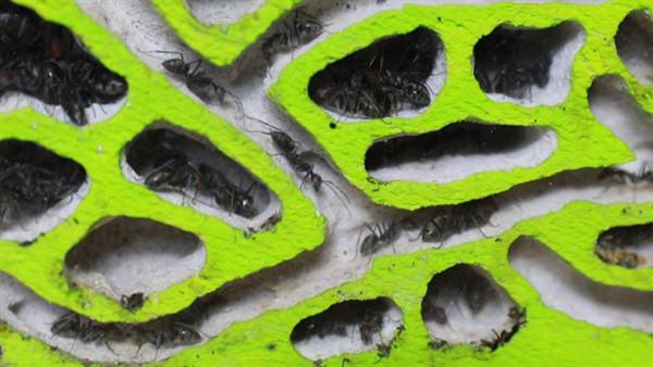 The lower component of the tank is a super-lightweight concrete block with pathways running through it, resembling an ant nest underground. The upper component – a transparent plastic box decorated with replica tree bark and leaves, is where the ants hunt their meals provided by the keeper.