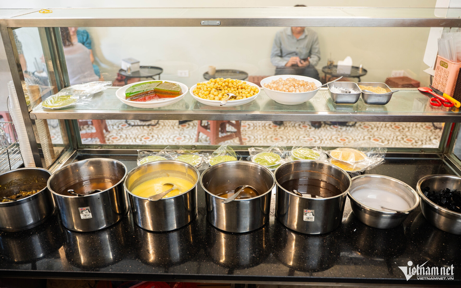 Inside a gleaming stainless-steel counter, nearly 20 trays of ingredients such as black beans, mung bean paste, tapioca pearls, lotus seeds, mung bean sticky rice, and grass jelly are neatly arranged. Pham Xuan Thanh, born in 1950 and the owner of Chè Mười Sáu on Lo Duc Street, skillfully scoops servings for the bustling crowd.