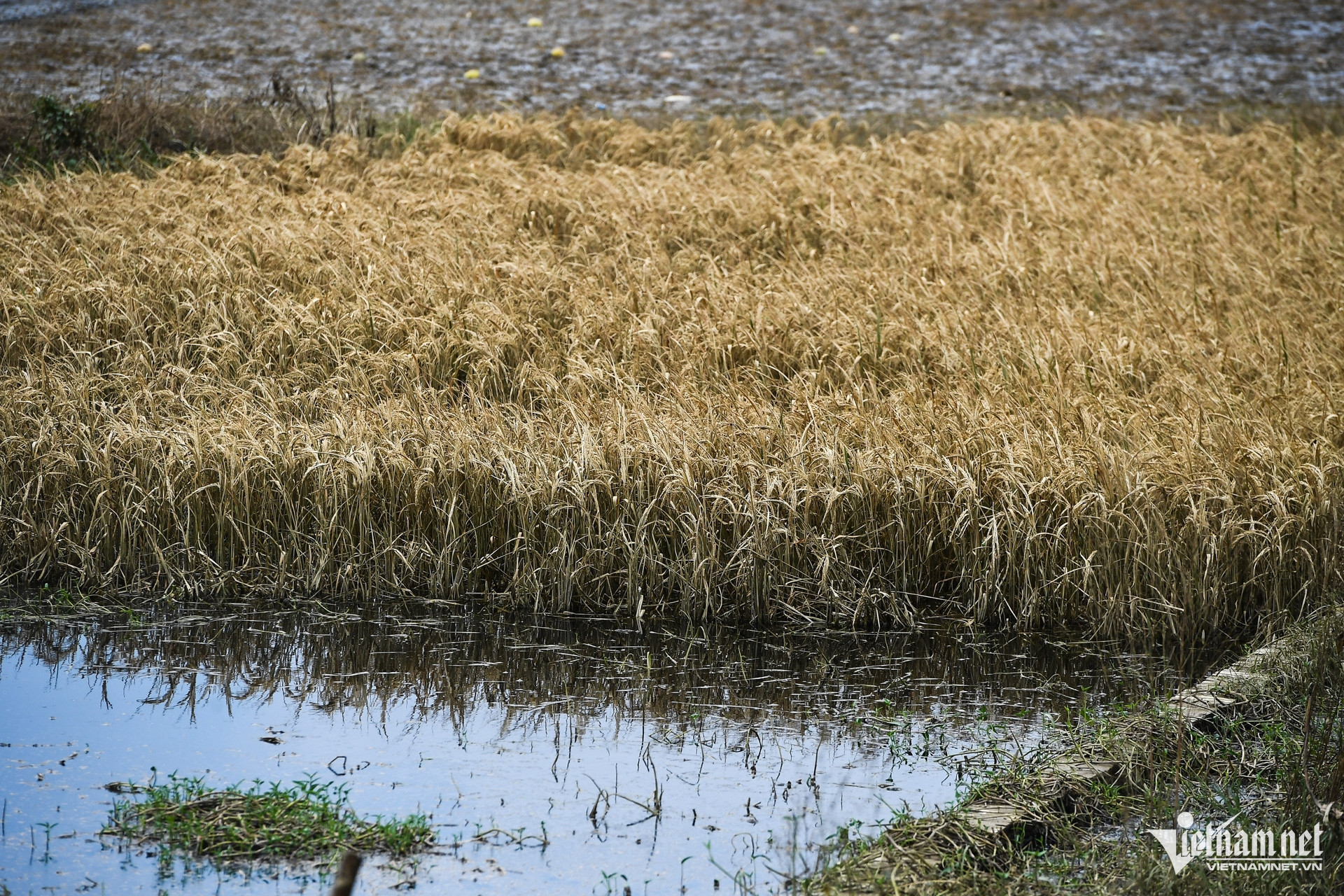 In the aftermath of Storm Yagi, many rice fields and crops in Soc Son district, Hanoi, were devastated by rising floodwaters from the Cau and Ca Lo rivers, leaving large swathes of farmland submerged and destroyed.