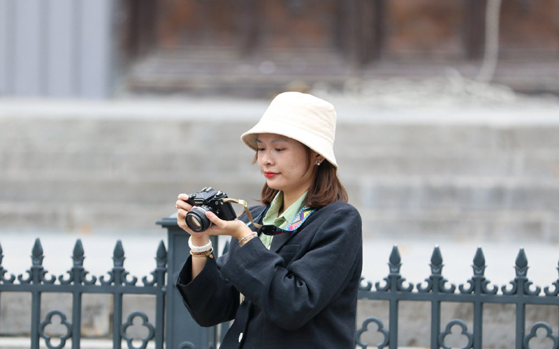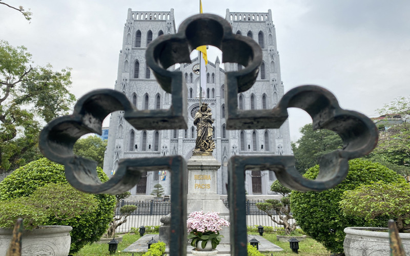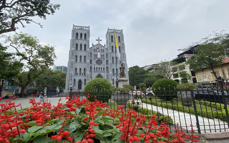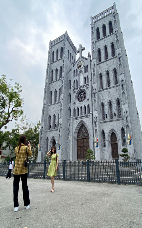 St Joseph's Cathedral has got a new look, attracting numerous visitors to admire and take photos.The cathedral's architecture is characterized by European medieval Gothic, somewhat resembling Notre Dame Cathedral in Paris with curved and wide domes.The watch on the cathedral's facade is in the process of being restored.The main door set in bronze with elaborate sculptures is kept original.The walls behind the church have all been whitewashed and still retain their ancient touches.Local young people flock to the cathedral square and take photos of the new look of the cathedral.A tourist is paying attention to view the photos she has just taken at the cathedral.