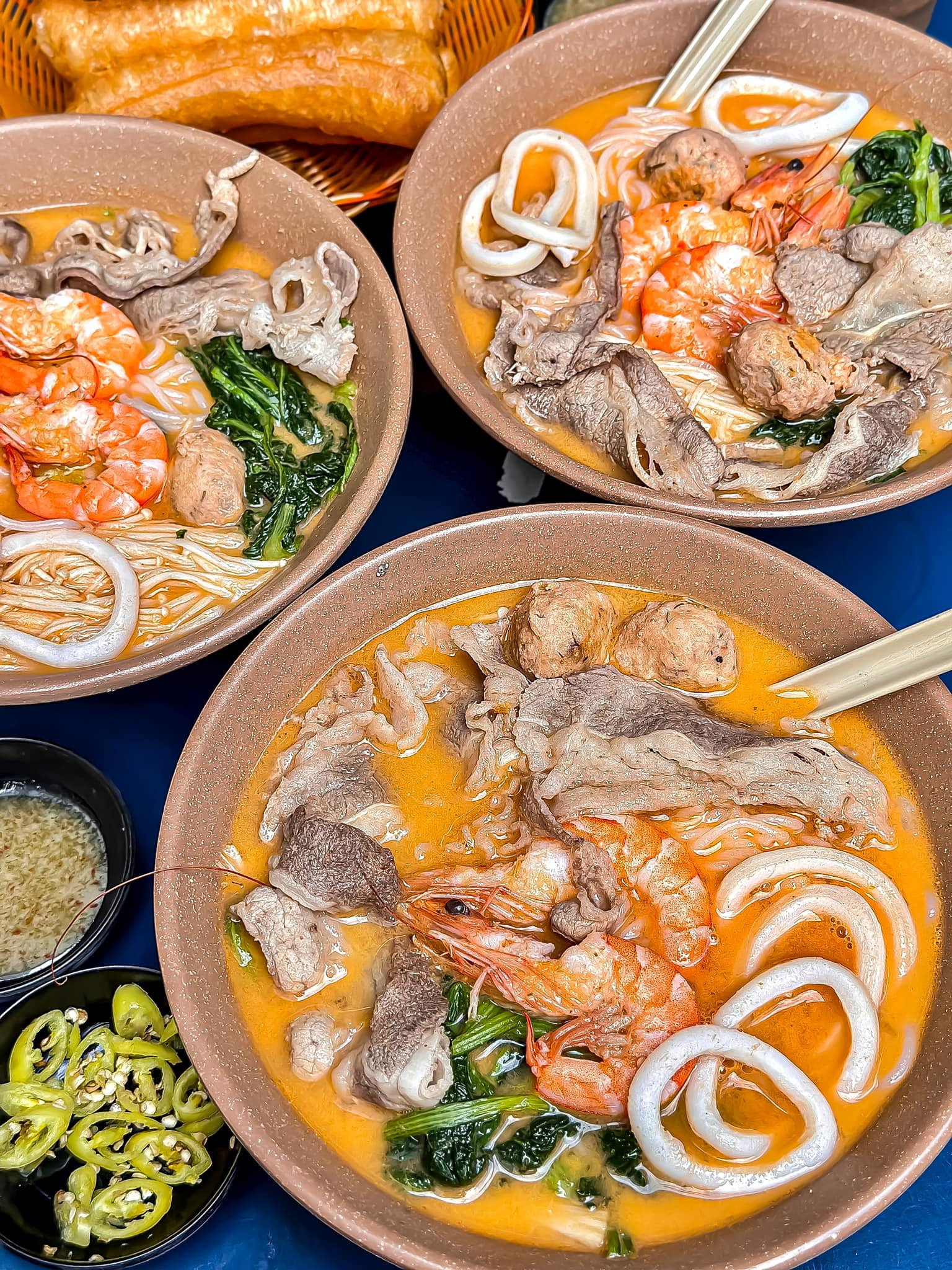The broth stands out with its vibrant color, enticing aroma, and rich flavor, blending the sour and spicy essence of seafood with coconut milk.