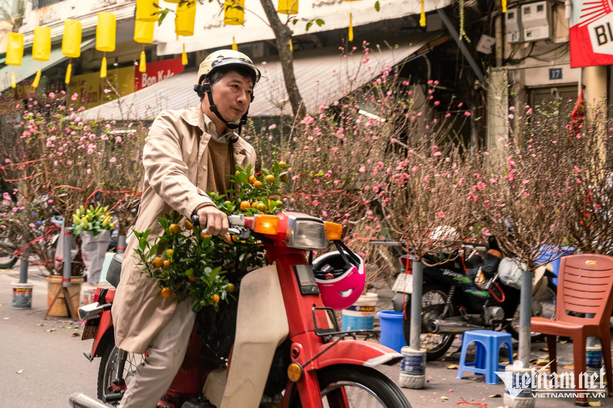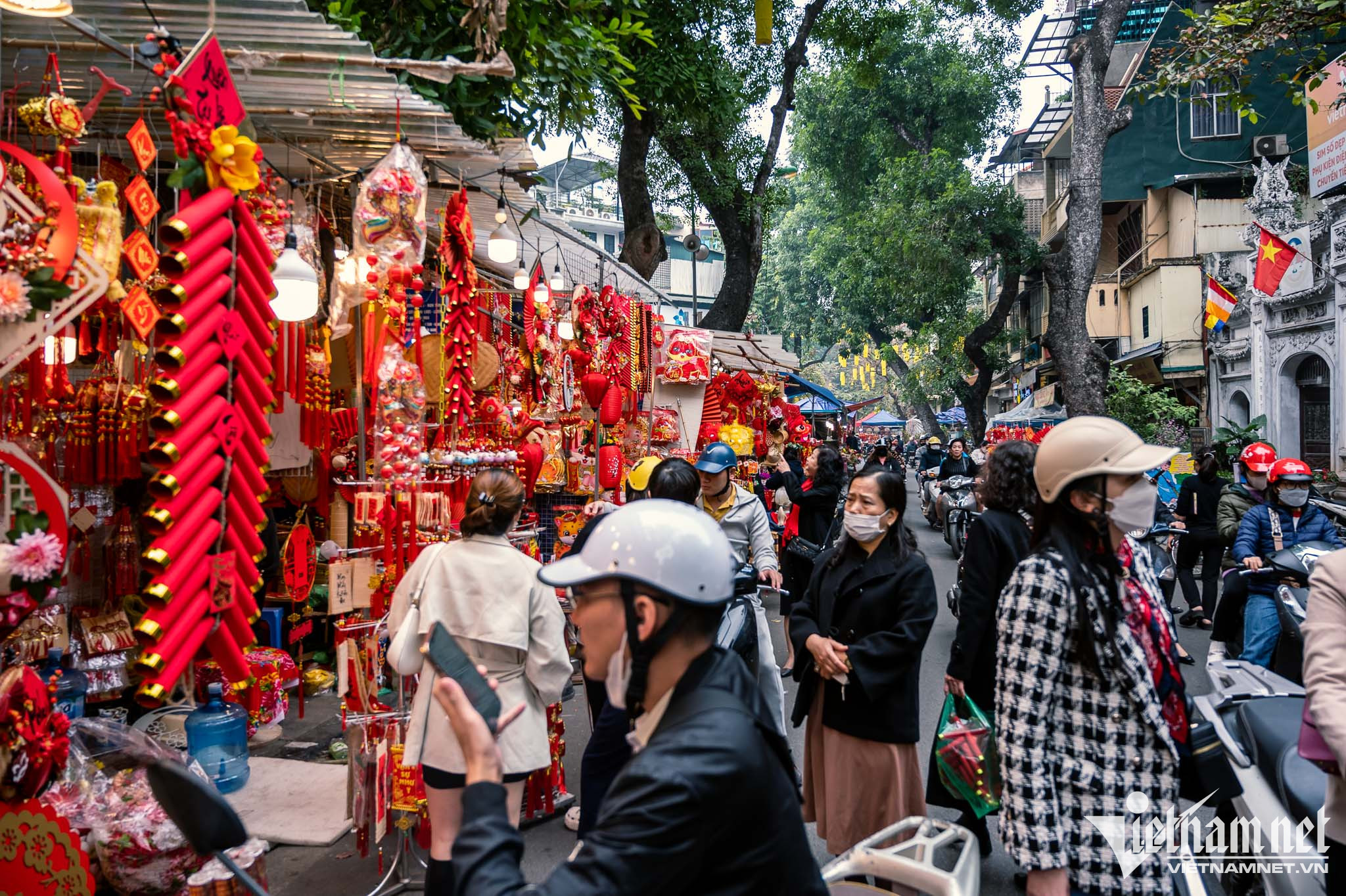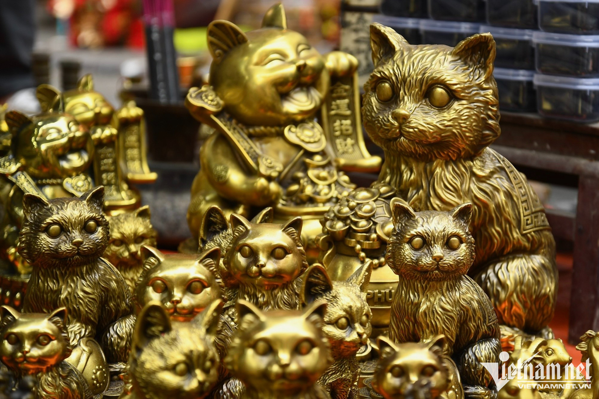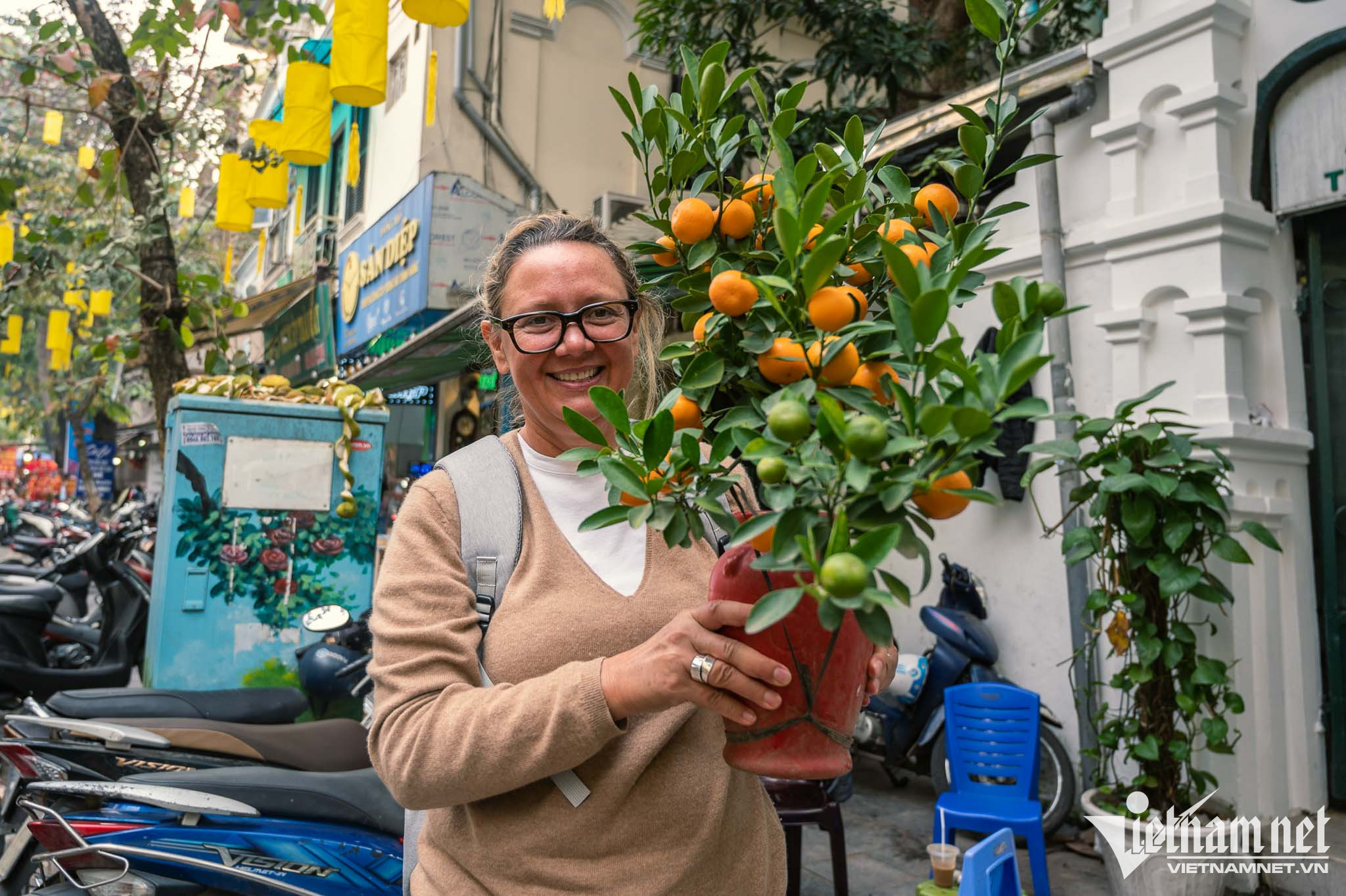 As the upcoming lunar year is the year of the cat, cat figurines are sold everywhere. They are made of a variety of materials, from gilded bronze to ceramics. The prices range from a few hundred thousand to several million VND/product.Hang Luoc flower market also attracts many international visitors. Ms. Veronique, an American tourist, came to Vietnam for the first time and was very excited to buy a kumquat tree for 300,000 VND.Mr. Hung from Nguyen Luong Bang Street bought a peach branch for 1.2 million VND.Small peach branches are priced from 50,000 VND to 200,000 VND. At a shop selling kumquats, the price is from 300,000 VND to 1 million VND/tree.Coming to Hang Luoc flower market, in addition to fresh flowers, people can also buy artificial flowers.Young people come here to take photos.