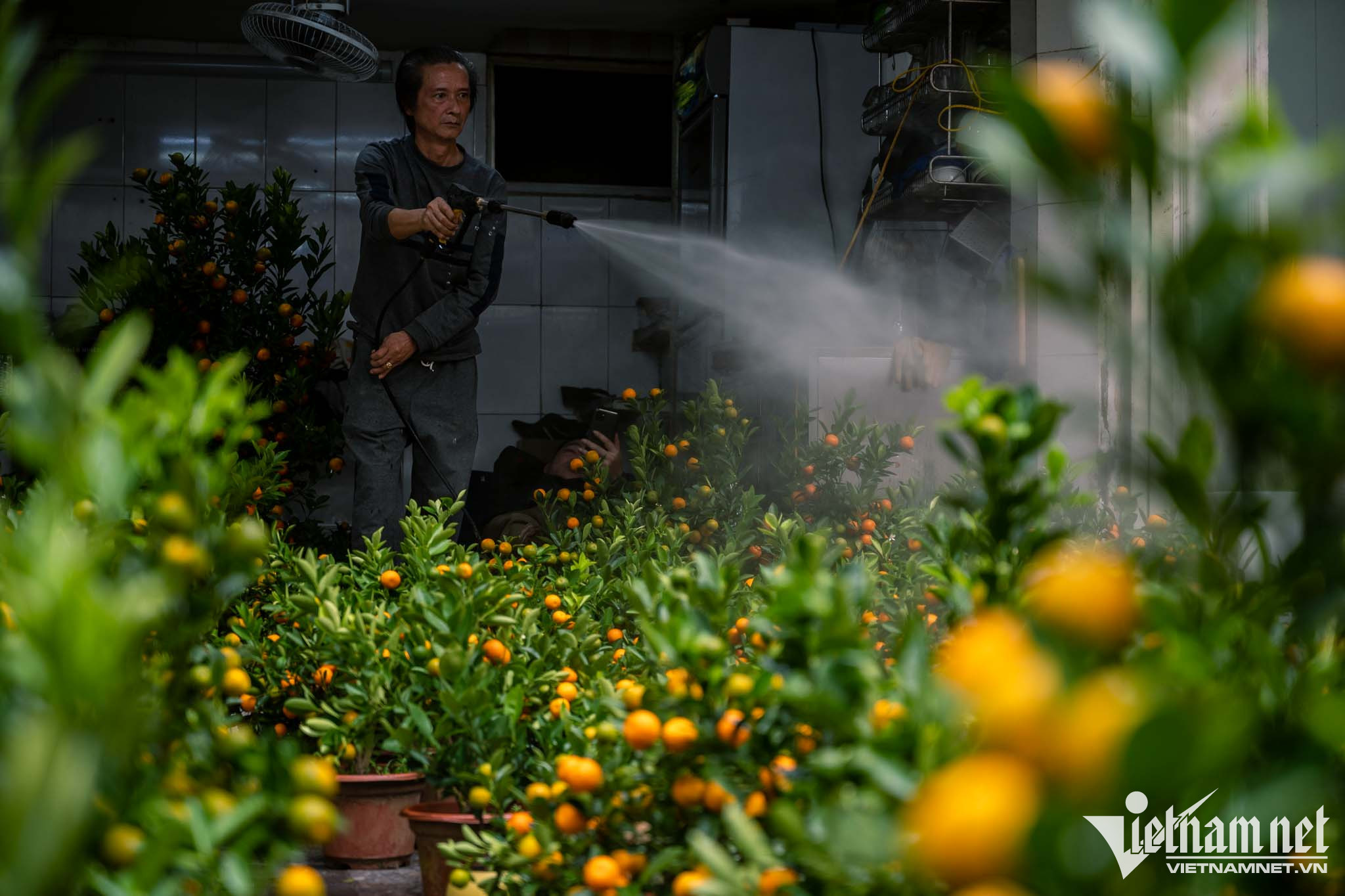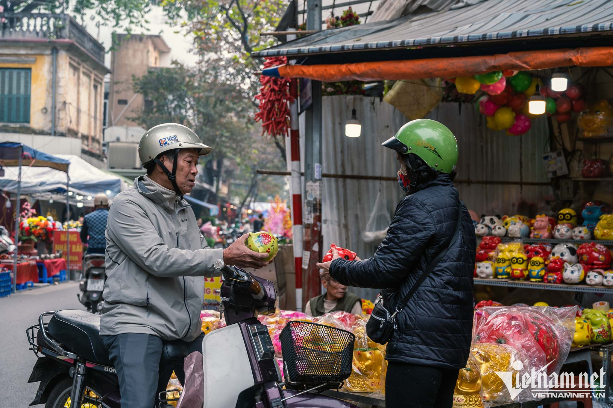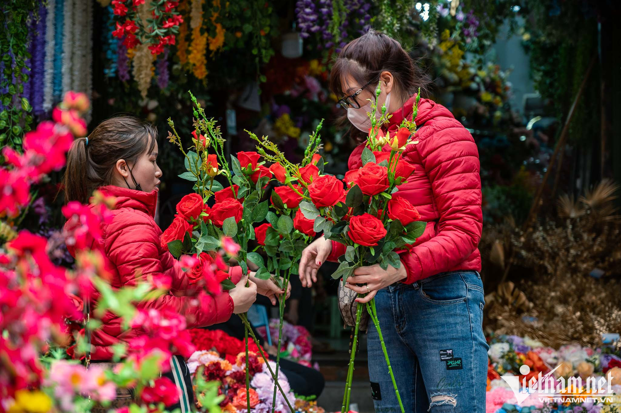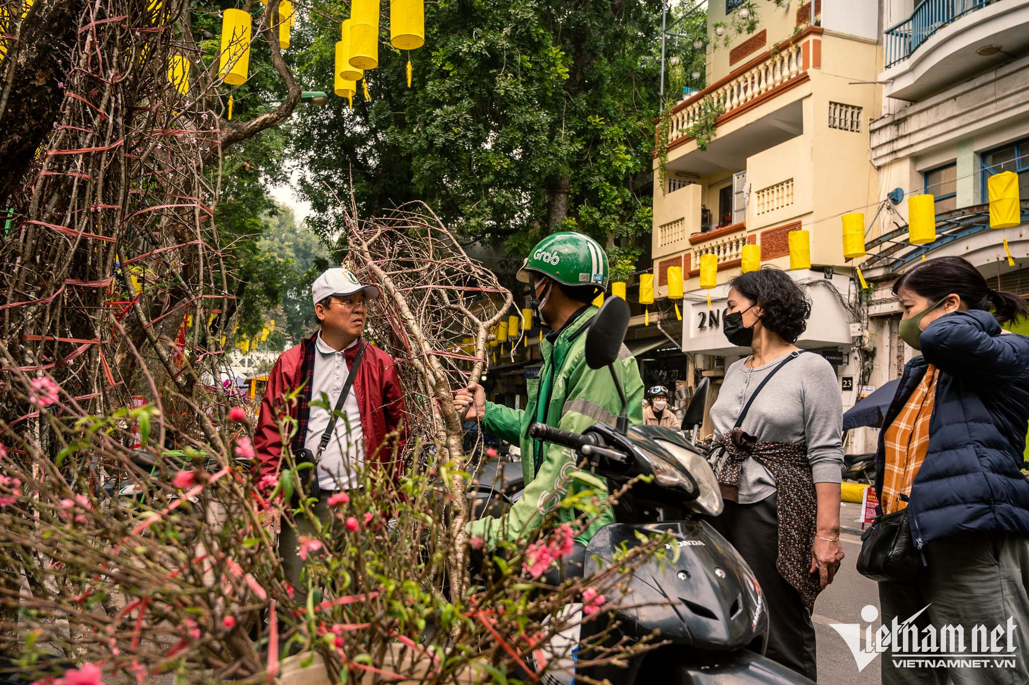 As the upcoming lunar year is the year of the cat, cat figurines are sold everywhere. They are made of a variety of materials, from gilded bronze to ceramics. The prices range from a few hundred thousand to several million VND/product.Hang Luoc flower market also attracts many international visitors. Ms. Veronique, an American tourist, came to Vietnam for the first time and was very excited to buy a kumquat tree for 300,000 VND.Mr. Hung from Nguyen Luong Bang Street bought a peach branch for 1.2 million VND.Small peach branches are priced from 50,000 VND to 200,000 VND. At a shop selling kumquats, the price is from 300,000 VND to 1 million VND/tree.Coming to Hang Luoc flower market, in addition to fresh flowers, people can also buy artificial flowers.Young people come here to take photos.