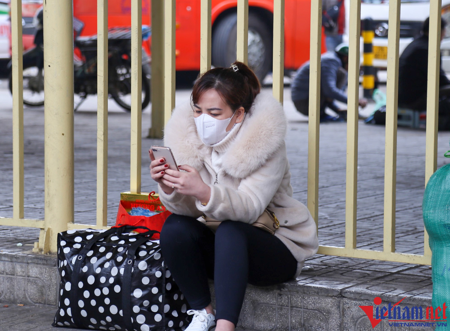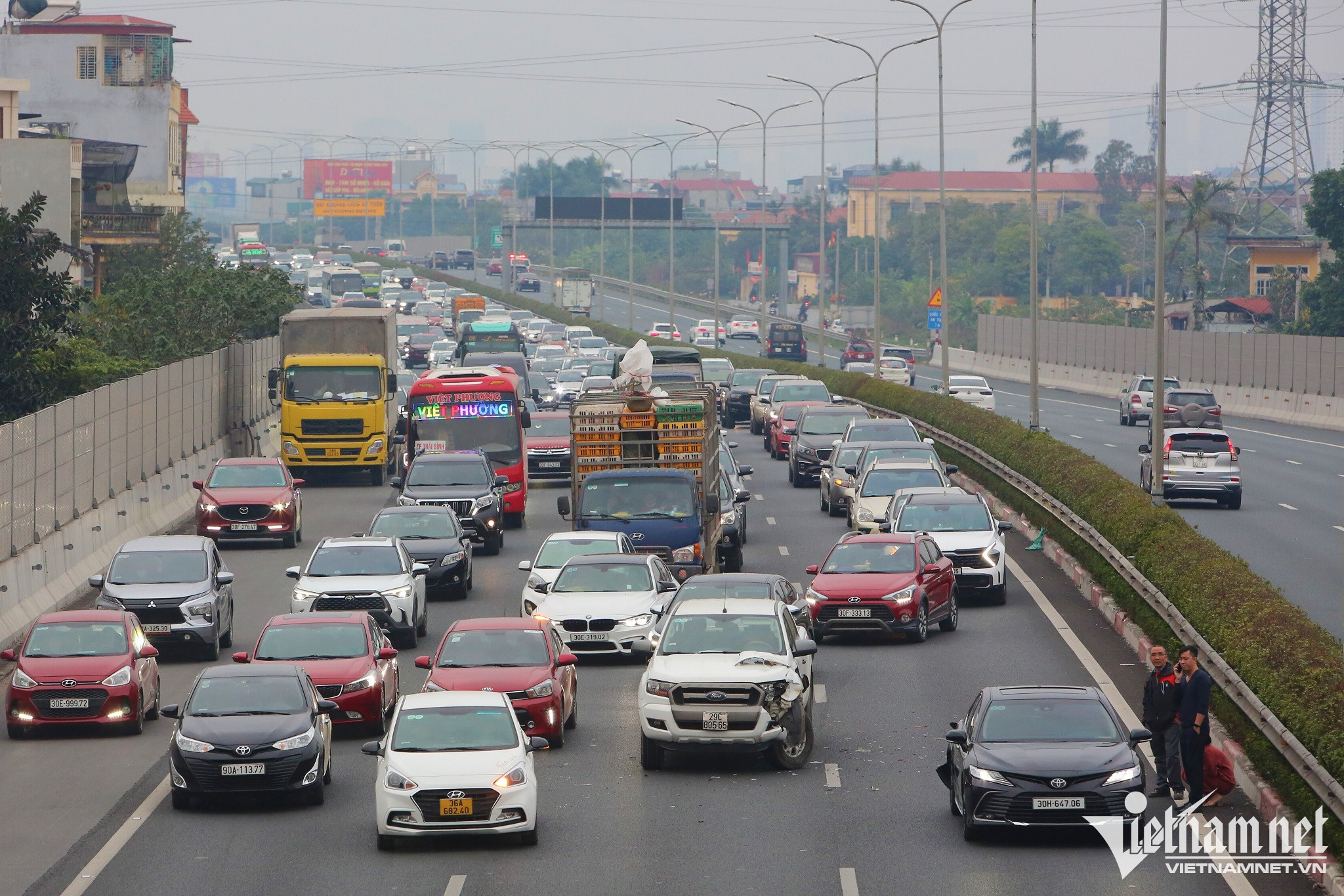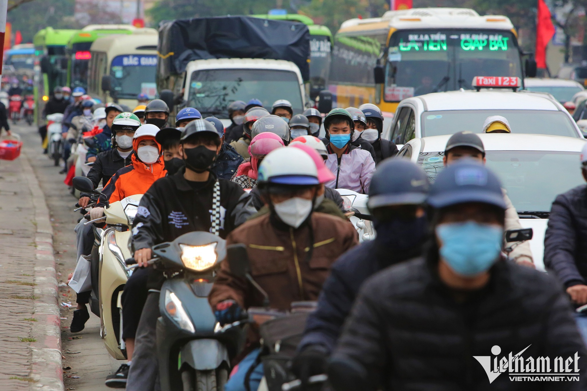 A long traffic jam Motorbikes carrying personal belongings slowly make their way to the gateways.People wait for passenger buses as they head back to their hometowns.Roads leading to the gateways are left congested as streams of vehicles try to return to their hometowns.Some vehicles are forced to move on the pavement to avoid traffic congestion.Lines of cars and motorcycles slowly depart the capital.Despite having to wait in standstill traffic on roads, many people are happy at the prospect of being able to return to their hometown to celebrate Tet.People wait for passenger buses as they head back to their hometowns.All of roads are fully occupied by automobiles, thereby forcing motorbikes to travel on the pavements or squeeze among queues of automobiles.