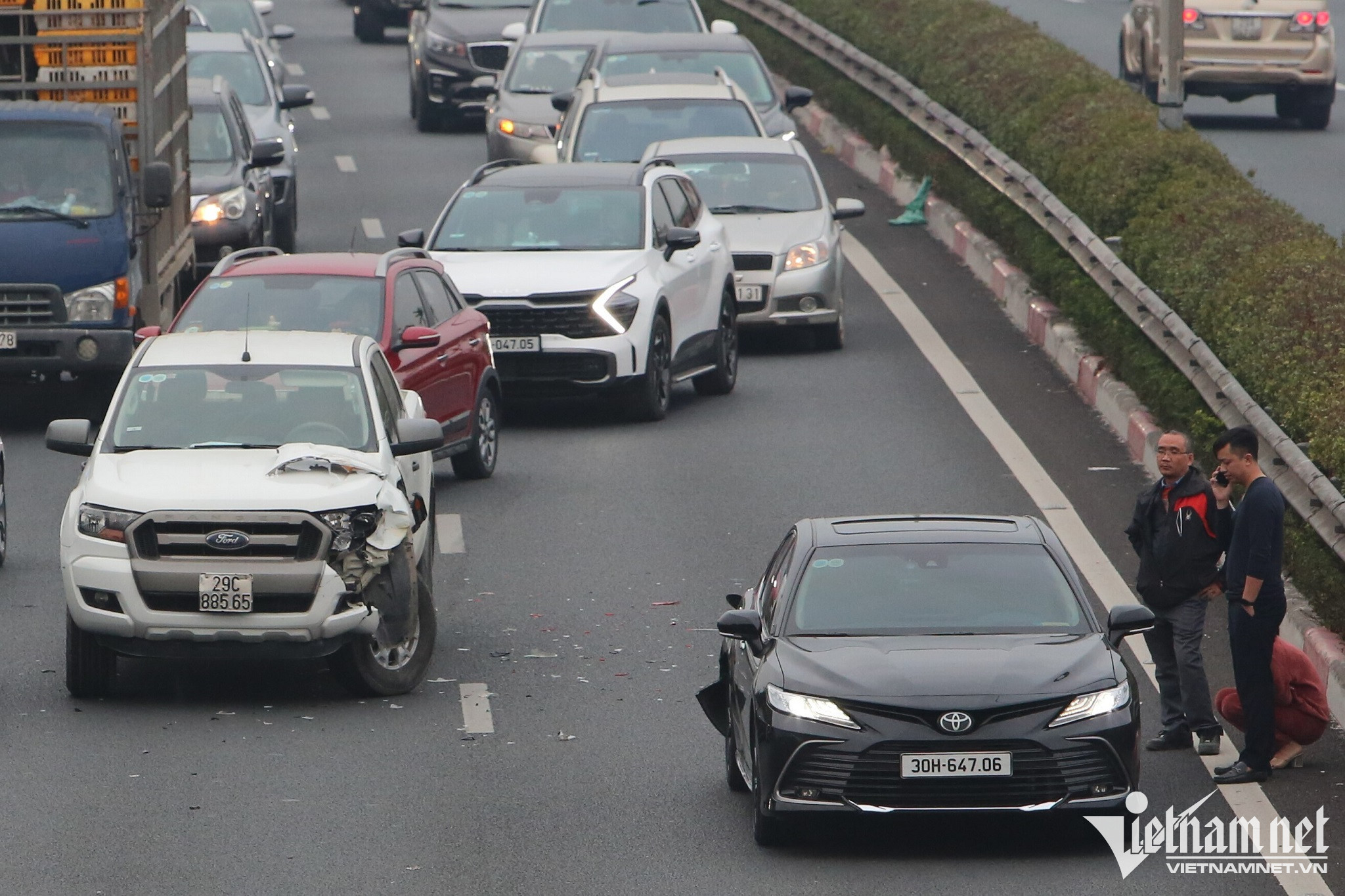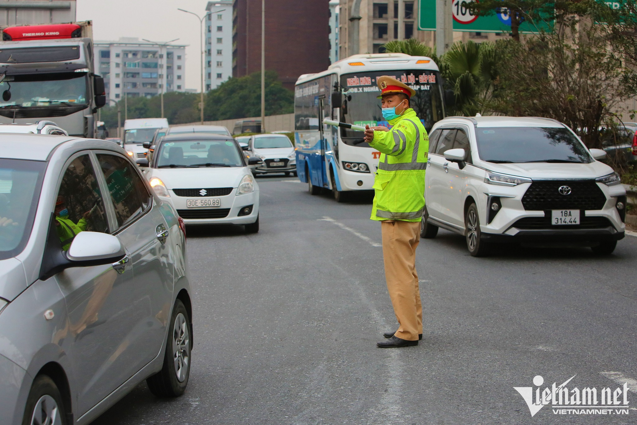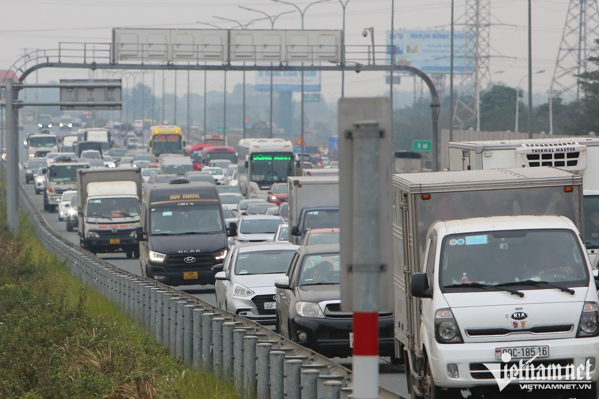 A long traffic jam Motorbikes carrying personal belongings slowly make their way to the gateways.People wait for passenger buses as they head back to their hometowns.Roads leading to the gateways are left congested as streams of vehicles try to return to their hometowns.Some vehicles are forced to move on the pavement to avoid traffic congestion.Lines of cars and motorcycles slowly depart the capital.Despite having to wait in standstill traffic on roads, many people are happy at the prospect of being able to return to their hometown to celebrate Tet.People wait for passenger buses as they head back to their hometowns.All of roads are fully occupied by automobiles, thereby forcing motorbikes to travel on the pavements or squeeze among queues of automobiles.