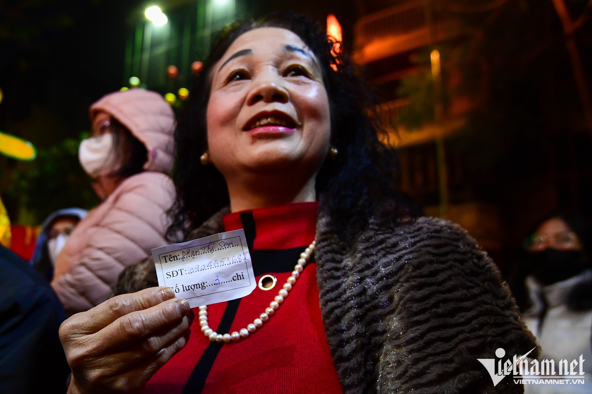 The 10th day of the lunar year, which falls on January 31 this year, is designated as the God of Wealth Day according to Vietnamese belief, with local people believing that fortune and prosperity will come to people who buy gold on that day. At a gold shop on Tran Nhan Tong street, Hai Ba Trung district, Hanoi, dubbed as a street of gold, although the lights weren't on yet, a few people queue up to purchase gold at 3am, January 31.Mr. To Hoa Binh from Dong Da district has always purchased gold on the God of Wealth Day for 12 consecutive years. This year he queued at a gold shop on Tran Nhan Tong Street from 3.30am.Mrs. Nhi from Hai Ba Trung district said that last year she went to a gold shop on Tran Nhan Tong Street at 6 am but found it too crowded, so this year she learned from experience and came here from 5 am.A gold shop at 5.30am.At gold stores on Hanoi's Tran Nhan Tong street at 5.50am, buyers queue in long lines as they wait to purchase gold on the God of Wealth Day.Ms. Nguyen Thi Hao from Hanoi's Hung Yen neighboring province, went to a gold shop on Tran Nhan Tong street at 4am in the hope of being one of the first lucky customers to buy gold on the God of Wealth Day.Each customer gets a ticket with their name, phone number and the amount of gold they want to buy.This gold shop opened at 6.30am.Mr. To Hoa Binh was the first customer who bought gold at this shop. As this lunar year is the Year of the Cat, customers prefer to buy zodiac animal statues and jewelry in the hope of obtaining financial success.Many people choose to buy gold cat figurines this year on the occasion of the God of Wealth Day.A gold shop in Cau Giay District prepared chairs for customers.The first customers at the shop.Customers wait for their turn.Customers here are also given a ticket to register their name, phone number and the amount of gold they want to buy so that the transaction can take place more smoothly and quickly.Ms. Dang Hong Phuong is lucky to be the first gold buyer at a gold shop on Cau Giay street.Gold prices recorded a slight decline before the God of Wealth Day.