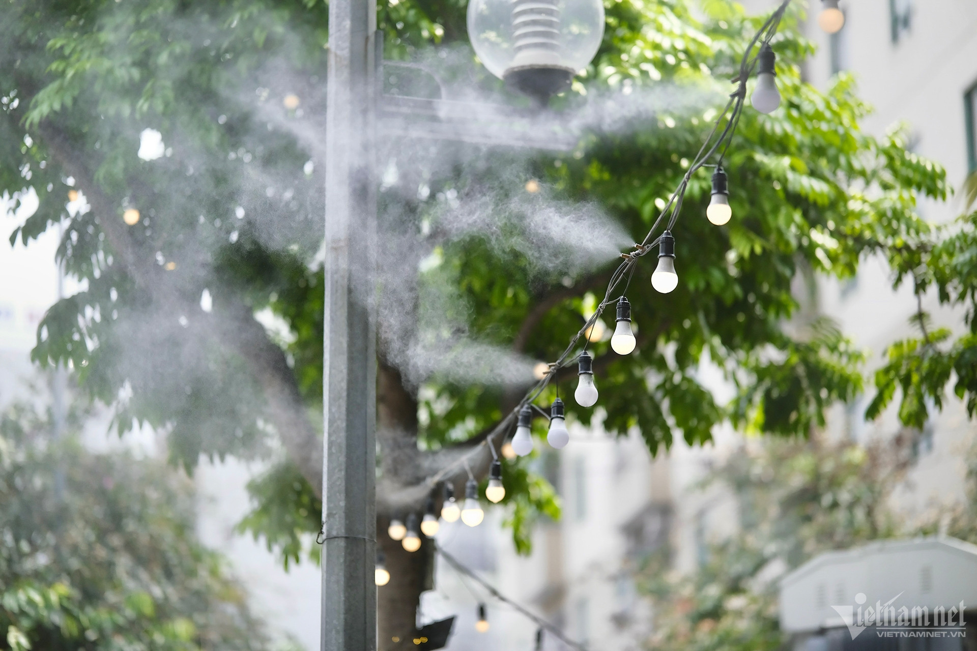 Customers flock to coffee shops and refreshment stalls equipped with misting systems to cool down in the scorching heat.