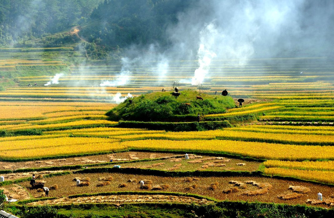 In the northern mountainous region, tourists can relish the vast and enchanting views of ripe terraced paddy fields. For instance, in Yen Bai Province, you can visit the fields in Khau Pha or in La Pan TanRipe terraced rice fields in Hoang Su Phi—a renowned district in Ha Giang ProvinceLocal farmers begin harvesting crops in Phung Village in Hoang Su PhiA hardworking Dao ethnic woman tends her fieldBut she is not alone. During the harvest season, local ethnic communities collaborate in teams to work on various fields, a practice known as “vần công”In the Mong Ngua terraced rice fields of Mu Cang Chai District, Yen Bai Province, farmers manually thresh the rice…… while others employ machineryJoy abounds in the fieldsA H’Mong ethnic woman takes a well-deserved break during her workFollowing the harvest, local farmers often burn rice strawMeanwhile, others gather straw that will feed their cattle in the upcoming winterAn ethnic woman makes her way home after a day of hard workTerraced rice fields resemble the map of Vietnam. For backpackers, especially photographers, this is the most inspiring season of all