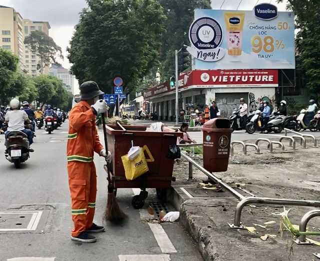 | A sanitation worker collects garbage on a street in HCM City’s District 3. — VNS Photo Nguyễn Diệp |