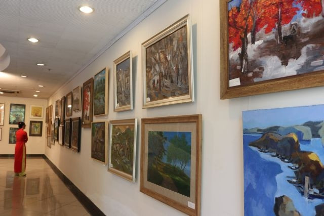 | The exhibition features paintings made from various materials such as oil paint, acrylic paint, water colour, silk, and fountain pen, and they centre around portraits, scenery, and still life objects. VNS Photo Gia Linh |