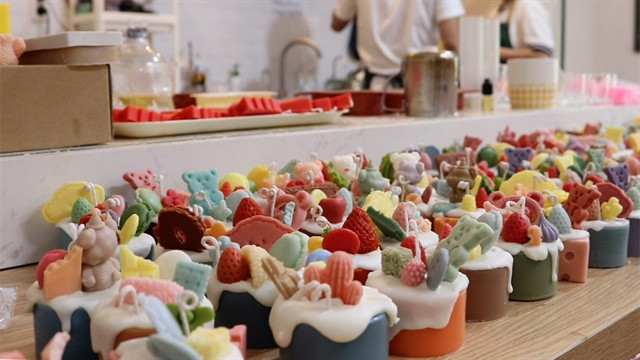 The workshop is a big hit among young people in the city hoping to relax by creating scented candles using provided materials such as candle wax, various essential oils, and decorative tools.