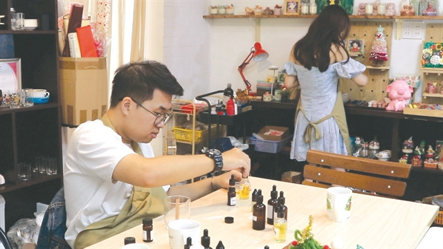 Nguyễn Trường Thịnh, 26, from Thủ Đức City, said this is the second time this month he has come to Thơm Heaven's workshop to make scented candles.