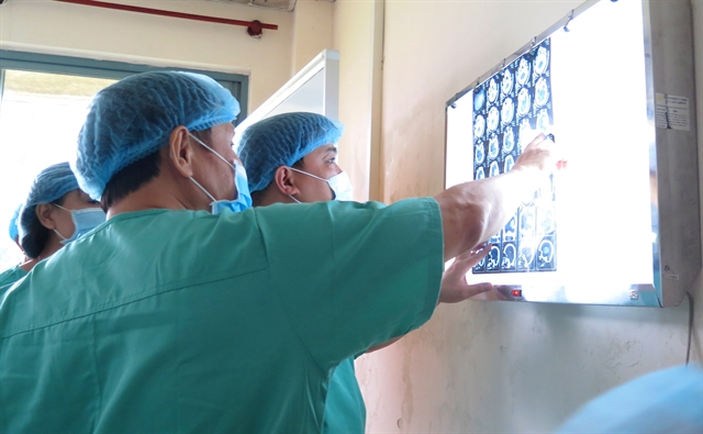 A doctor of the Oncology Hospital checks a patient in the temporary isolation room. Amid the fourth wave of the pandemic that has hit many key hospitals in Việt Nam, the central province of Thanh Hóa has identified cases with close contact to positive patients or linked to locked-down hospitals like the National Hospital for Tropical Disease or the National Cancer Hospital in Hà Nội.