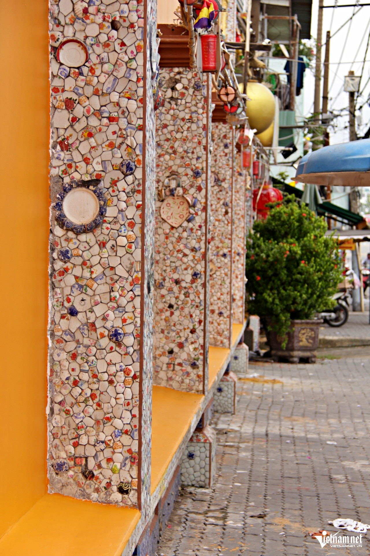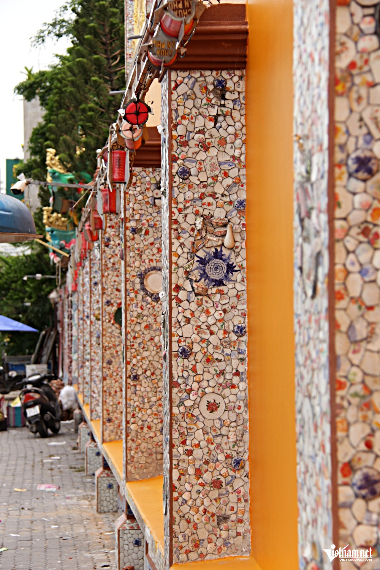 During the renovation, Venerable Thich Tu Bach envisioned decorating the temple using discarded porcelain and ceramic fragments. Monks broke the collected pieces into smaller shards, shaped them into artistic designs, and carefully attached them to walls, columns, and staircases. The motifs included Buddha statues, lotus flowers, the swastika symbol, and depictions of Guanyin Bodhisattva.