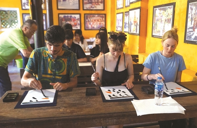 | Tourists and locals experience a Japanese calligraphy class at the programme. VNA/VNS Photo Bang Nhiệm |