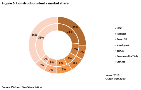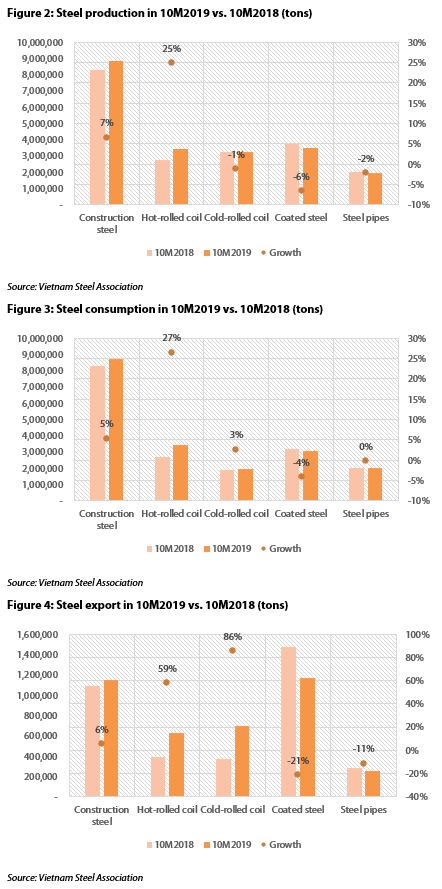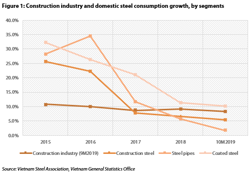After several years of development at a significantly faster pace compared to the construction industry growth, the rise in steel consumption is slowing down gradually and impacting the growth rate of the construction industry. Over the first 10 months of 2019, total domestic sales of Vietnam Steel Association’s members grew 7.88%, which could be affected by a lower growth rate of construction activities (8.3% in a nine-month period of 2019 versus 9.2% in 2018).