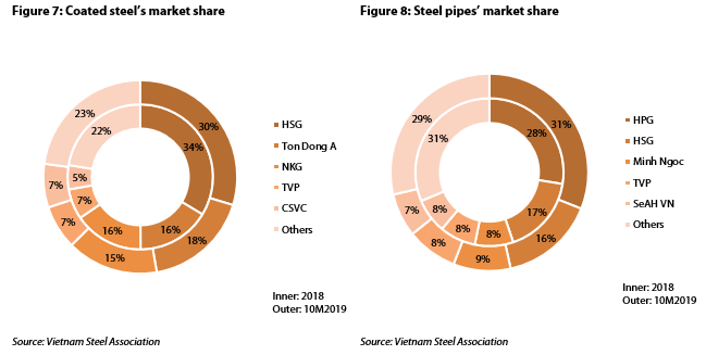Meanwhile, there were significant shifts in the coated steel segment as Hoa Sen Group (HSG)’s market share dropped from 34% in 2018 to 30% in the first ten months of 2019, while Ton Dong A gained 2% more of total selling volume. The reason is the change in HSG’s orientation that will prioritize maintaining the gross profit margin of around 13%, instead of reducing the price to gain market share. In the steel pipe market, HPG has been growing strongly to gain 3% more of market volume and still ranked first with 31% in terms of market share, followed by HSG and Minh Ngoc. Hanoitimes