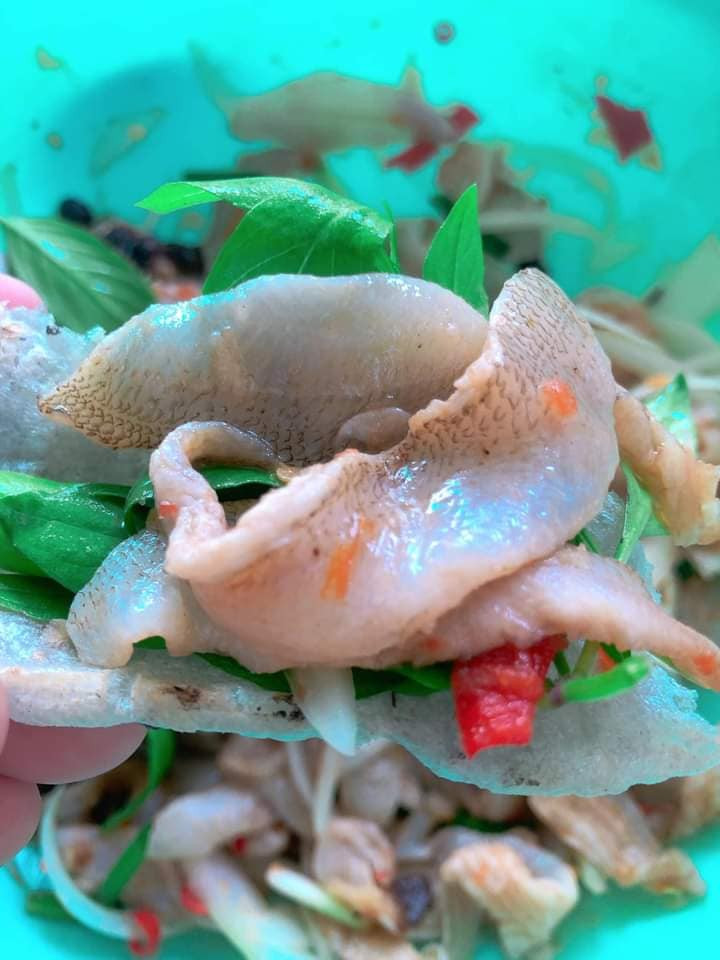 “The filleted fish is rinsed with diluted lemon juice to remove any odor and lightly ‘cook’ the meat before mixing it into the goi,” Thanh added. Depending on regional variations, some chefs prefer squeezing lemon juice directly over the fish for marination. The juice is also saved for making a special dipping sauce.