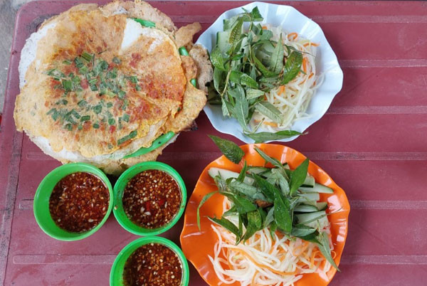 A bowl of sweet and sour fish sauce is served with banh ep and made spicy to meet Hue’s standards. Diners roll the cake with herbs, pickled papayas, shredded cucumbers and carrots, dip it into the fish sauce and savor it.