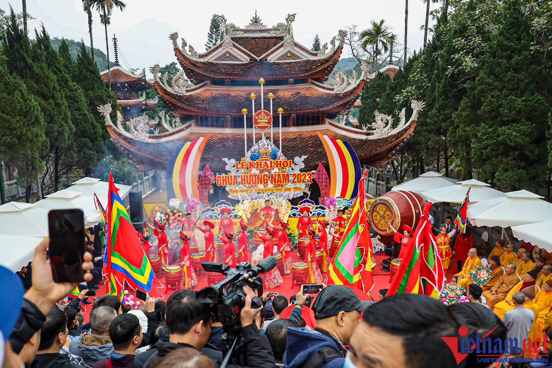 Most Venerable Thich Minh Hien, the abbot of Huong Pagoda, beat the drum to open the festival and offered incense to pray for national peace and prosperity.
