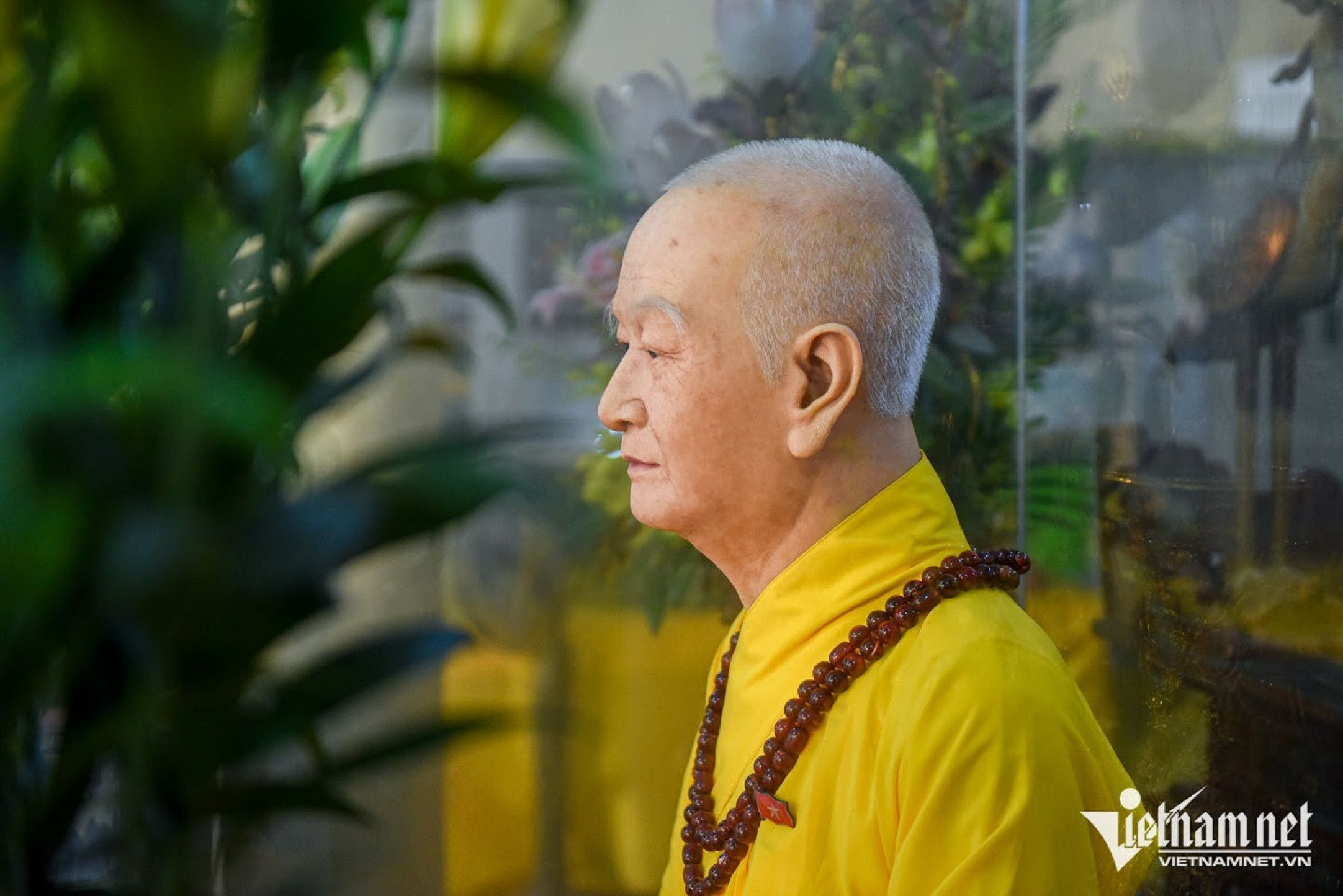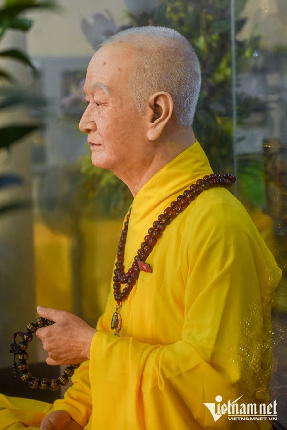 The statue-makers enlarged Venerable Thich Thanh Tu's photo to observe every detail. A unique feature of this statue is that the real hair of the Venerable was attached to the wax figure.