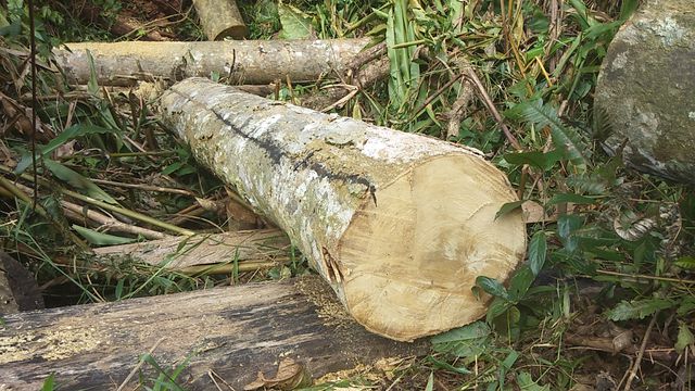 Dozens of trees, including many older ones, have been felled and then chopped into pieces which are around 3-5 metres long. Part of the trees has been taken away by loggers.