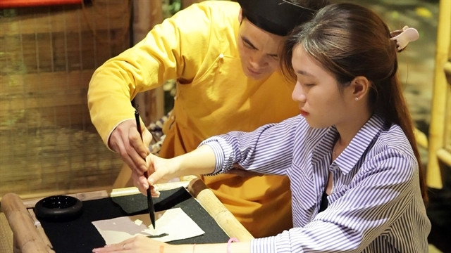 | MASTER'S CLASS: A visitor experiences the traditional scholar's classroom during the night tour. VNS Photo Trinh Nguyễn |