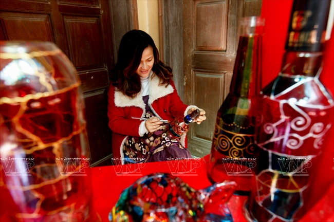 ![]() Nguyen Dieu Thuy decorates bottles at the couple’s workshop on Dang Tien Dong street, Hanoi.