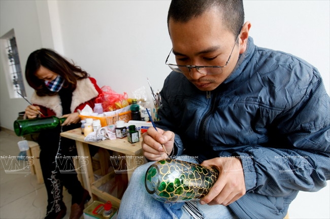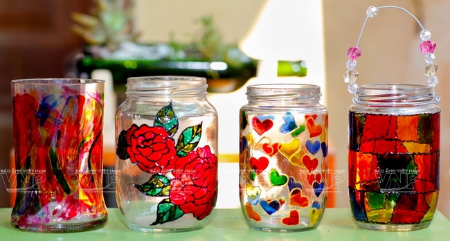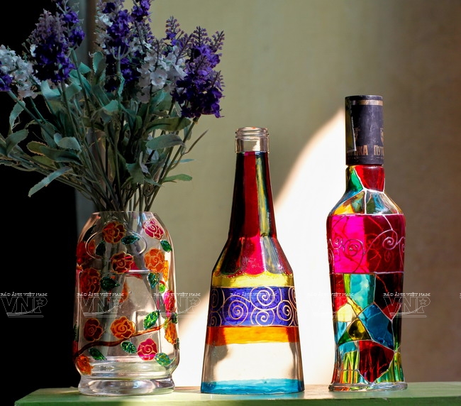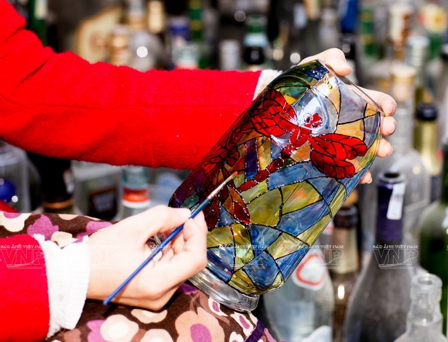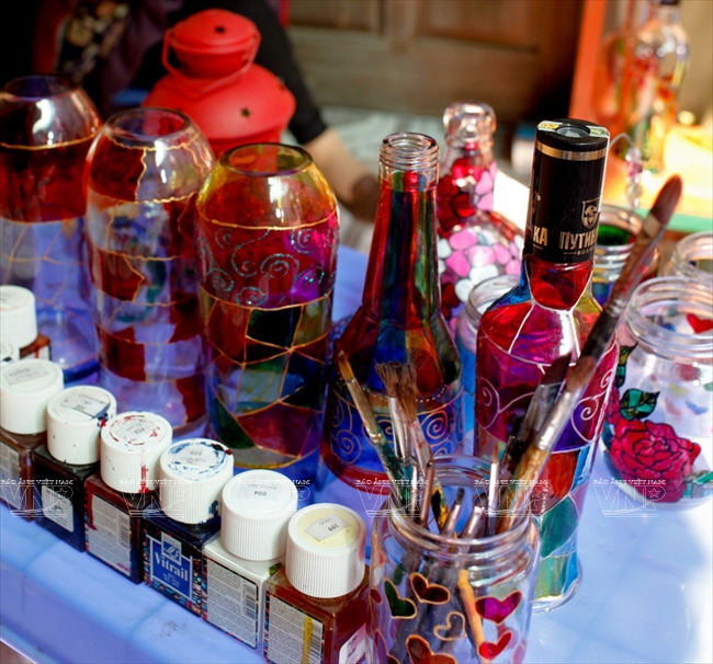 and environmental slogans on the bottles to create attractive products. Techniques and skills learned from Hanoi University of Industrial Fine Arts help them a lot in the painting.