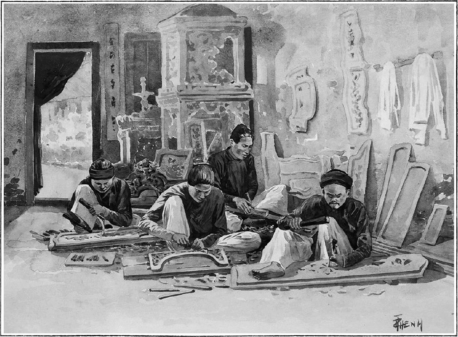 Children in Hanoi buy lanterns during the Mid-Autumn Festival.The scene of Nam Giao rituals of the Nguyen Dynasty. Nam Giao Altar is where the Nguyen kings held the annual spring festival. An exam in Nam Dinh in 1888.An outdoor art class.A calligrapher.Carpenters carving wooden objects, and paintings by artist Thang Tran Phenh. Painter Thang Tran Phenh is considered one of the first artists who created the foundation for the modern "Vietnamese art house".