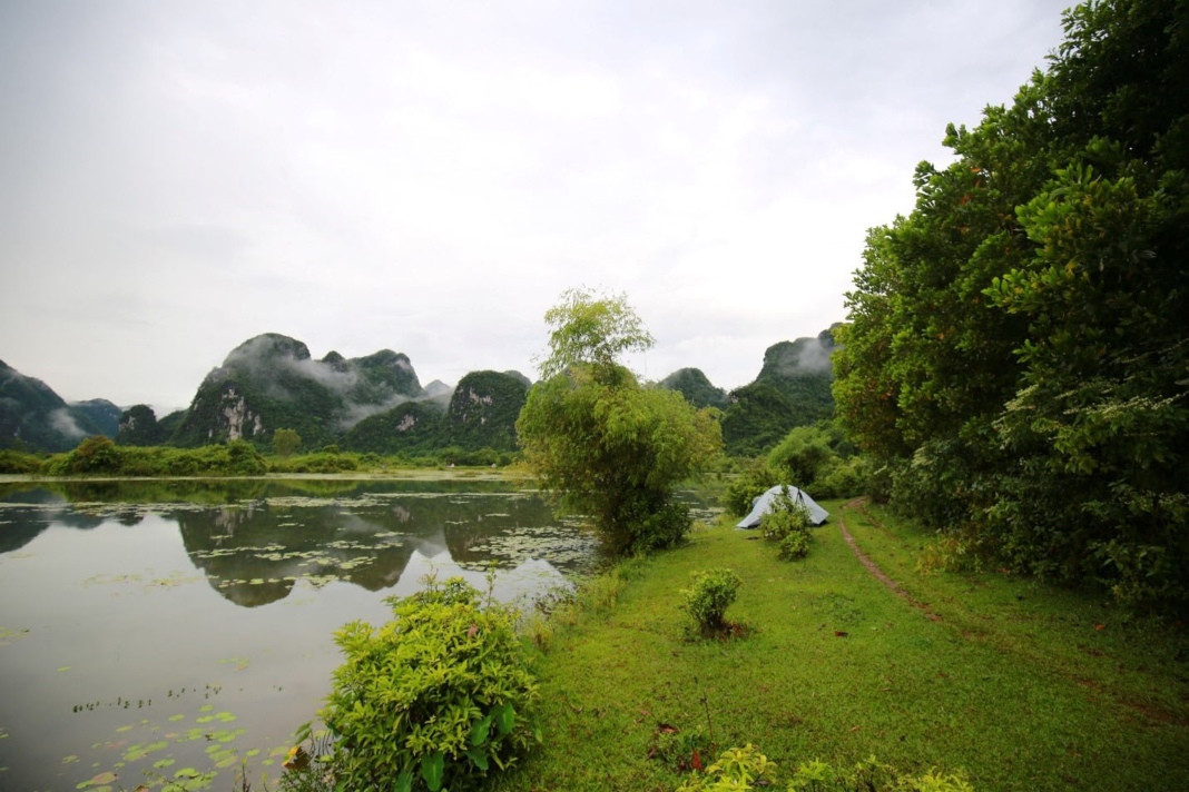 There are undulating limestone mountain ranges stretching on the water’s surface. Early morning, these limestones are more fanciful amid the morning mist. At sunset, when the sky turns to a mysterious light pink, the water’s surface reflects the limestone, creating a magnificent scene.