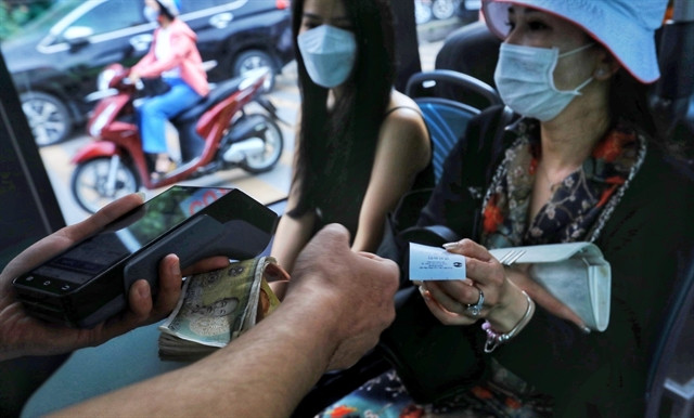 | Passengers buy tickets while travelling on a bus in Hà Nội. Bus fares will rise from early 2024. VNA/VNS Photo Tuấn Anh |