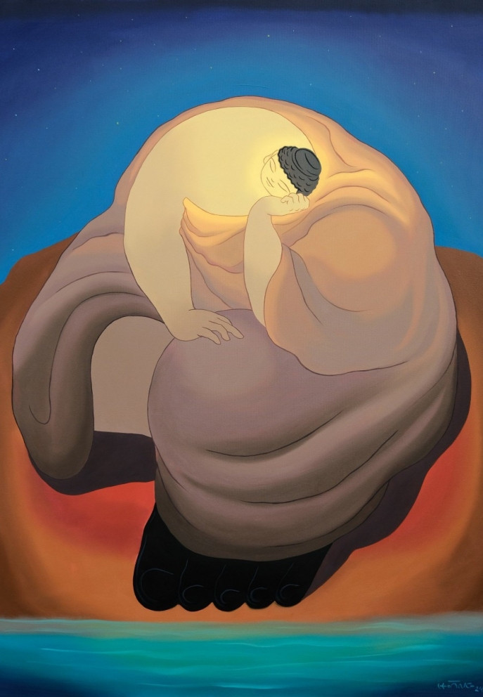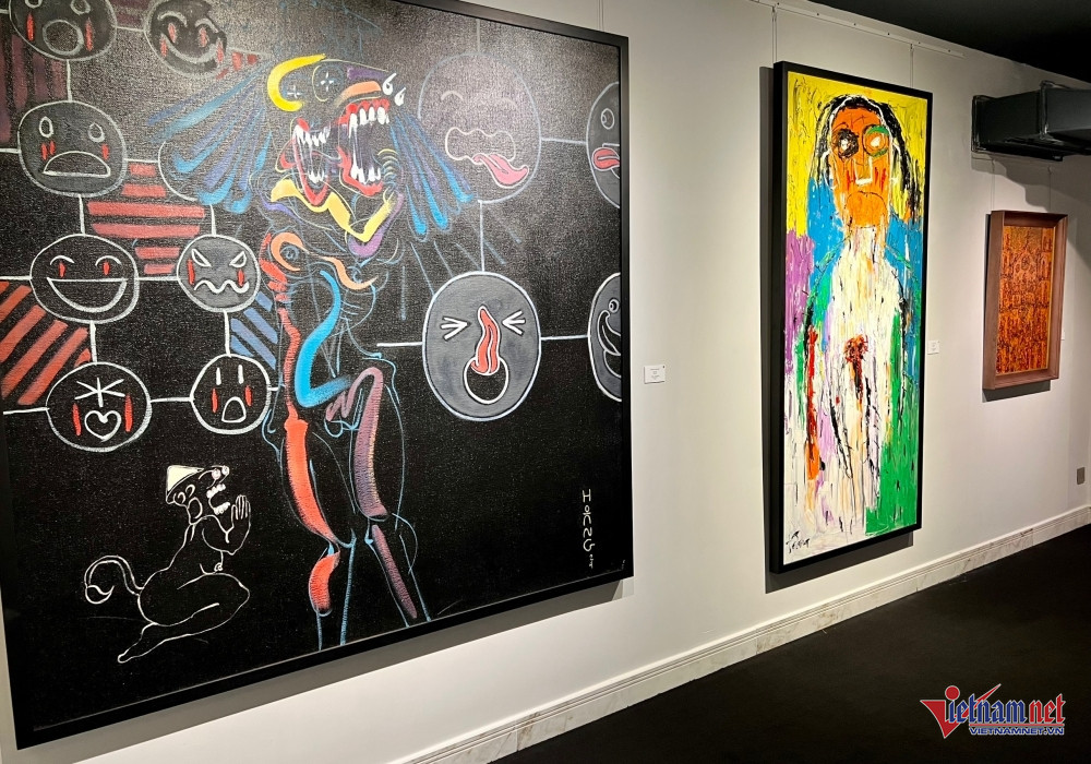 Le Thi Minh Tam, the only female artist in the exhibition, contributes five large-scale paintings inspired by legends like Lac Long Quan and mythical fairies. Her characters have distinctive, even bizarre, appearances that challenge traditional folk images.